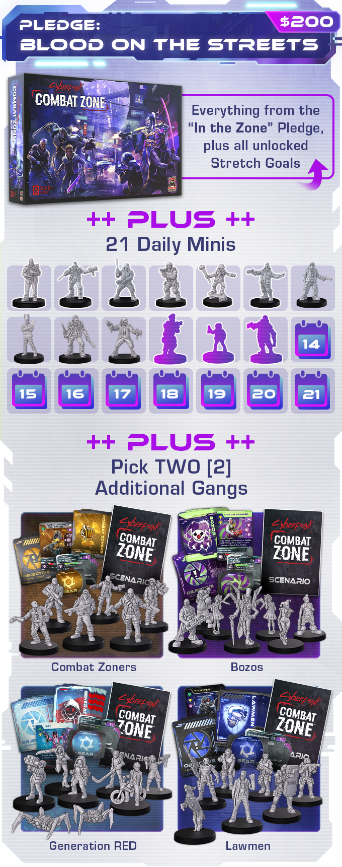 We’ll pick a winner at random from all the answers at the end of the contest. And the prize? They’ll be given a prize package equal to the $200 pledge level of the Cyberpunk RED: Combat Zone Kickstarter. That will give the winner the base game, 21 additional minis, all unlocked Stretch Goals, and two additional gang sets!